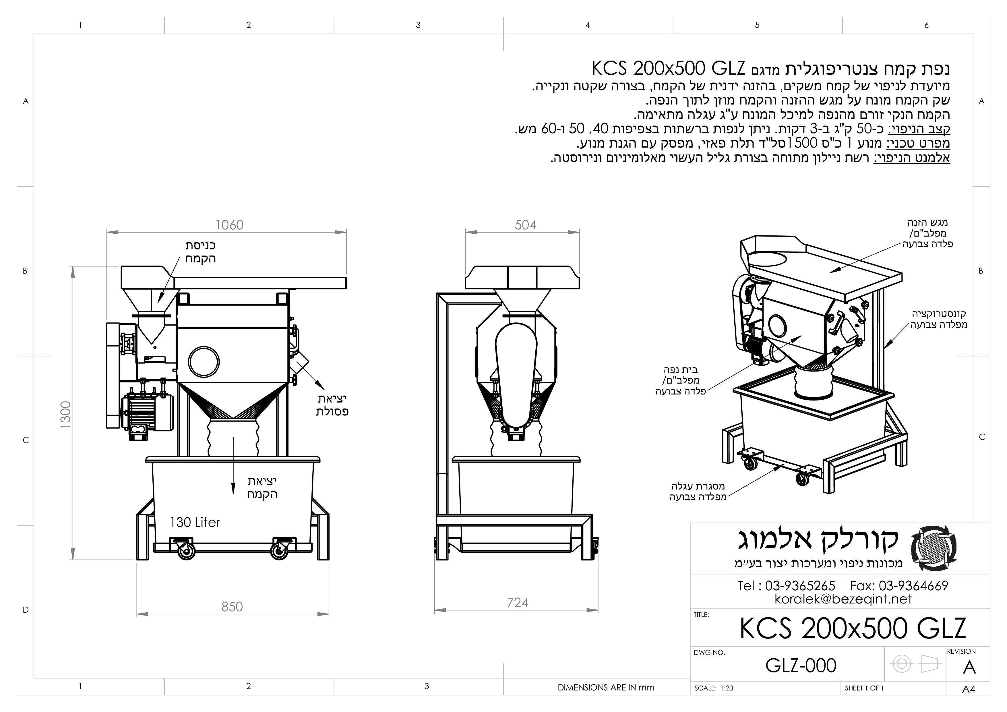 נפת קמח צנטריפוגלית מדגם GLZ 200X500 המיועדת לניפוי של קמחים משקים, בהזנה ידנית של הקמח. השק מונח על משפך ההזנה והקמח מוזן לתוך הנפה. הקמח הנקי זורם מהנפה למיכל המונח ע"ג עגלה מתאימה. קצב הניפוי: 50 כ- ק"ג ב-3 דקות. ניתן לנפות ברשת בצפיפות 50 ו-60 מש וברשתות נוספות.
