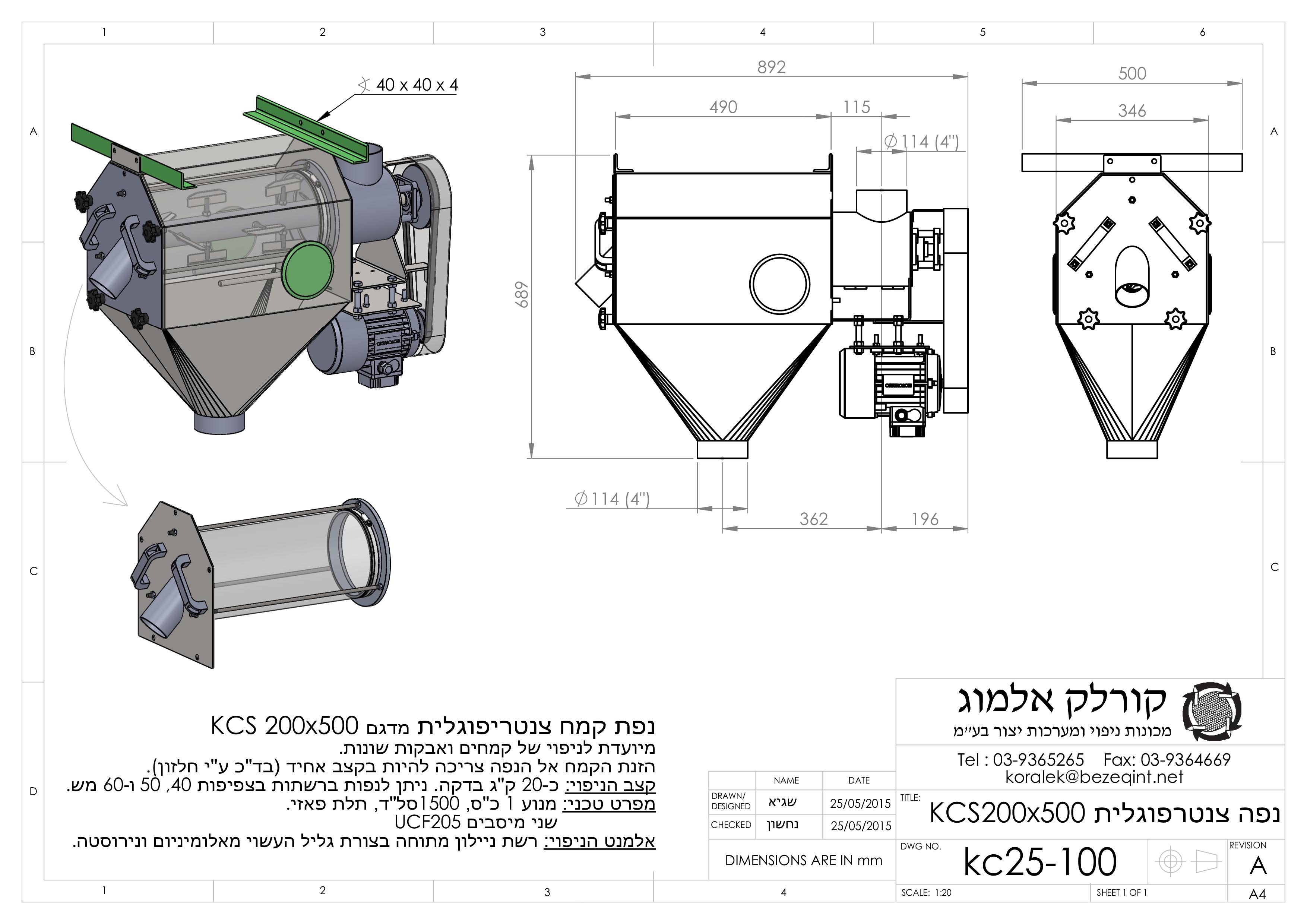 נפת קמח צנטריפוגלית המתאימה למאפיות ולאבקות אחרות מלבד קמח. הנפה בעלת תוף ניפוי בקוטר 200 מ"מ ובאורך 500 מ"מ. הנפה בעלת ספיקה של 1.5 טון קמח בשעה ברשת 50 מש!! פעולת המכונה שקטה. תחזוקת המכונה קלה וניתנת לניקוי בקלות. יתרונות משמעותיים בתחום הכשרות, ניתן לבדוק את הרשת ולהחליפה בקלות ובמהירות. המכונה בעלת מנוע 1 כ"ס ובמהירות 1500 סל"ד.
